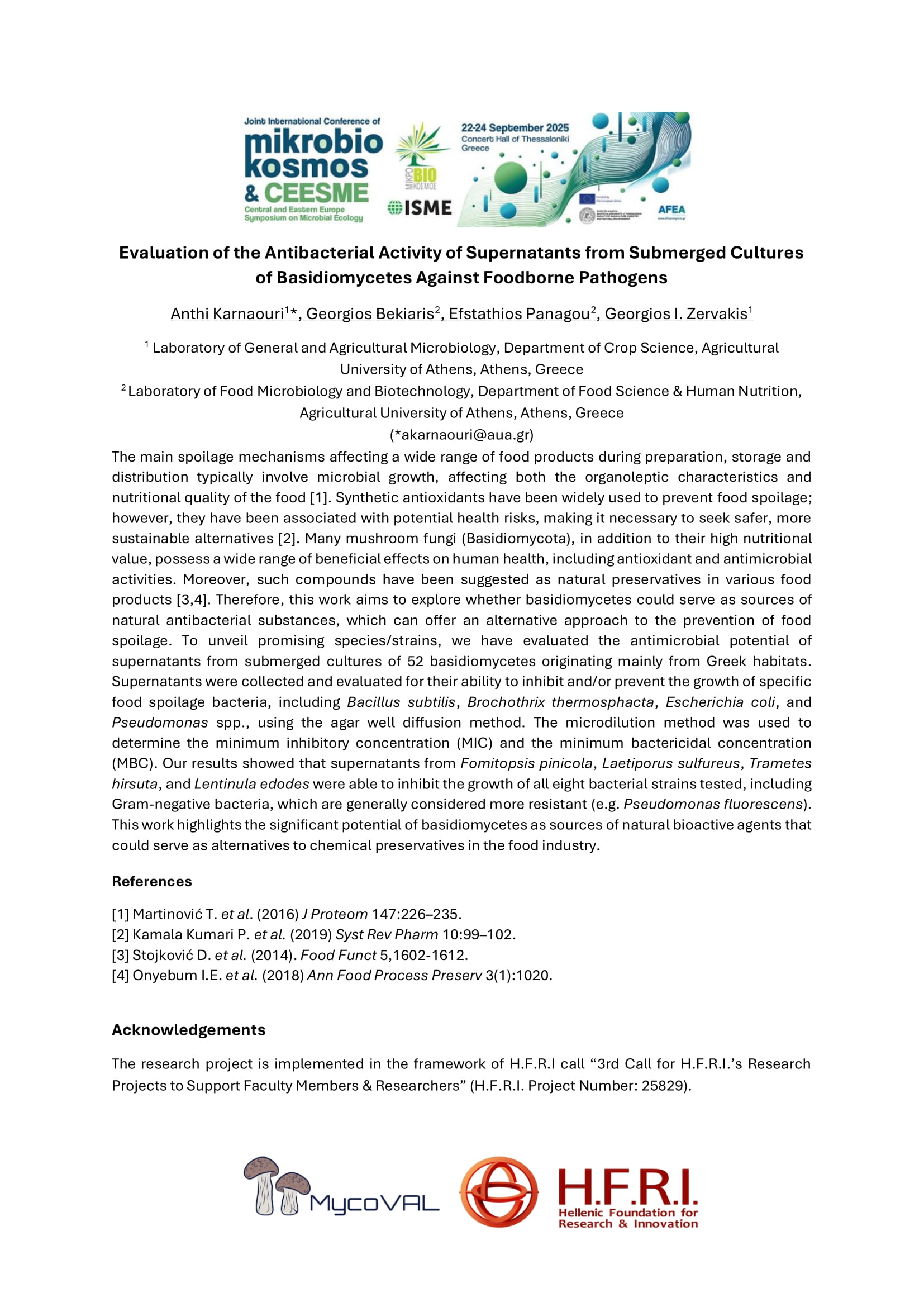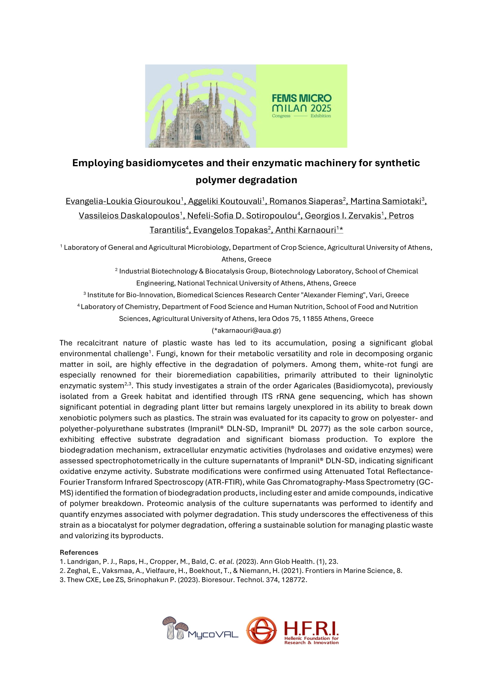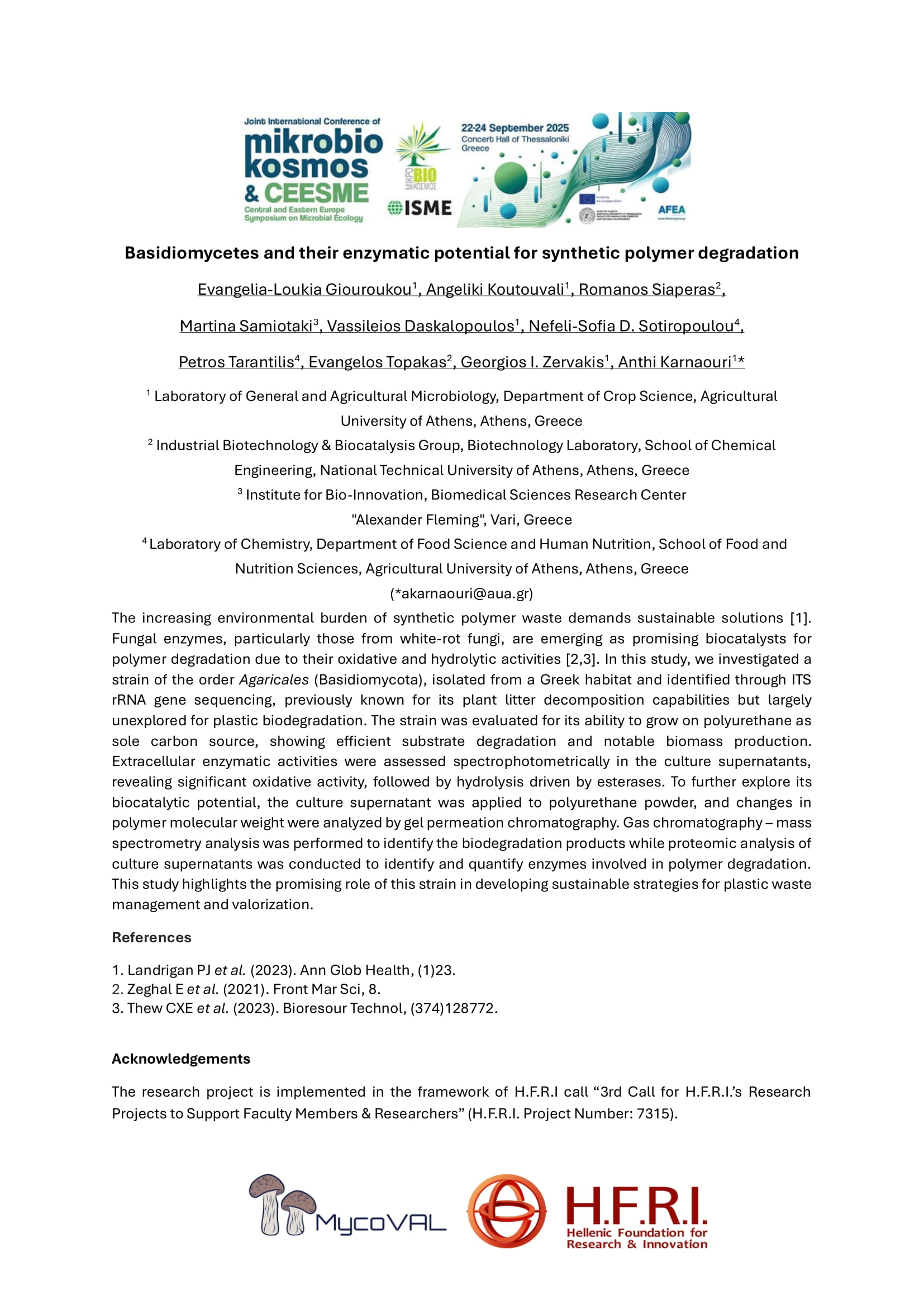 Giouroukou E.L., Koutouvali A., Siaperas R., Samiotaki M., Daskalopoulos V., Sotiropoulou N.S.-D., Zervakis G.I., Tarantilis P., Topakas E., Karnaouri A. Basidiomycetes and their enzymatic potential for synthetic polymer degradation, Oral Presentation, Mikrobiokosmos & CEESME Conference, Thessaloniki, Greece, 2025.